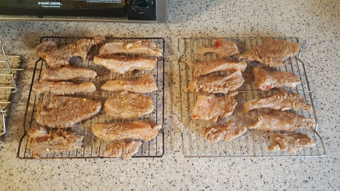 5. Lay the meat out on racks to dry, using a fan to blow on them. You can also try the oven on the lowest possible setting. I have relented a bit from my earlier hesitation to use oven-drying. As long as you don’t set the heat too high, you should generally be fine.