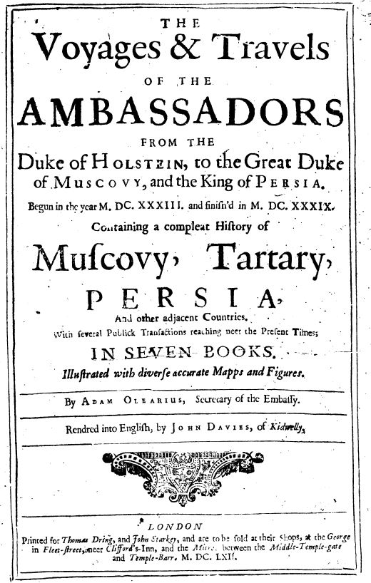 The party left Germany in 1634 and reached Moscow in August 1634, stopping at Reval, Narva, and Novgorod along the way. At Moscow they secured an audience with Tsar Michael I. Olearius’s wonderful account of these happenings was translated into English by John Davies in 1662 under the title Voyages and Travels from the Duke of Holstein to the Great Duke of Muscovy and the King of Persia.