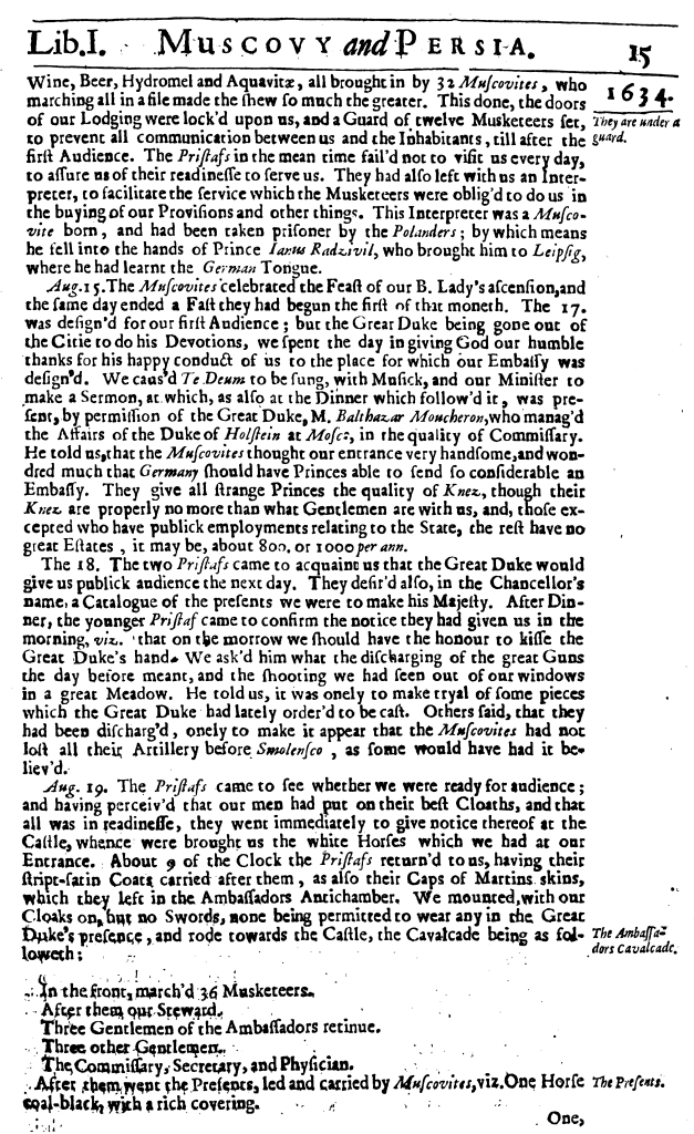 The Muſcovites celebrated the Feaſt of our B[lessed] Lady’s Aſcenſion, and the ſame day ended a Faſt they had begun the firſt of that moneth. The 17th was deſign’d for our firſt Audience [with the Great Duke of Muscovy]; but the Great Duke being gone out of the Citie to do his Devotions, we ſpent the day in giving God our humble thanks for his happy conduct of us to the place for which our Embaſſy was deſign’d. We caus’d Te Deum to be ſung, with Muſick, and our Miniſter to make a Sermon, at which, as alſo at the Dinner which follow’d it, was preſent, by permiſſion of the Great Duke, M. Balthazar Moucheron,who manag’d the Affairs of the Duke of Holſtein at Moſcow, in the quality of Commiſſary. He told us,that the Muſcovites thought our entrance very handſome, and wondred much that Germany ſhould have Princes able to ſend ſo conſiderable an Embaſſy…