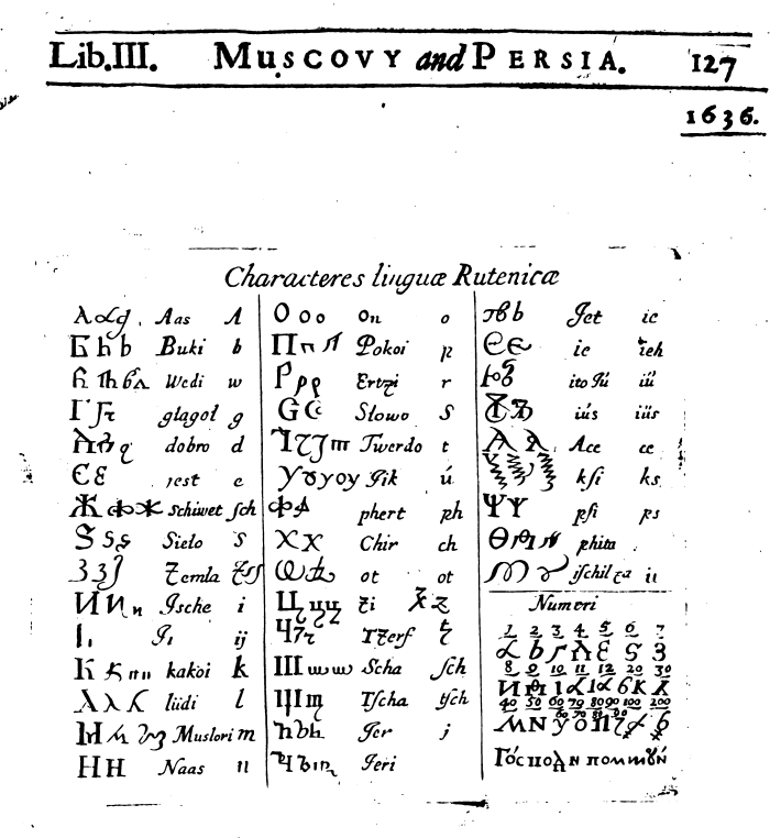 Olearius’s transcription of the Cyrillic alphabet, published in his “Travels.”