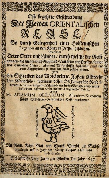 He was born Adam Ölschläger (or Oehlschlaeger) near Magdeburg, the largest city in Saxony-Anhalt. We know very little about his early life, but he must have shown great promise as a youth, for he was able to secure a position with Frederick III, Duke of Holstein-Gottorp as a mathematician and librarian. He must also have been seen as a man of diplomacy, tact, and linguistic ability; in 1633 he was asked to take part in an expedition to Russia (called in those days “Muscovy”) and Persia. The purpose of the delegation was commercial: Frederick was interested in the financial opportunities presented by the silk trade, and felt that good relations with the Russians and Persians was a means to this end. From his writings it seems clear that, besides the expected fluency in Latin, Olearius had at least a working knowledge of Russian, Turkish, and Persian.