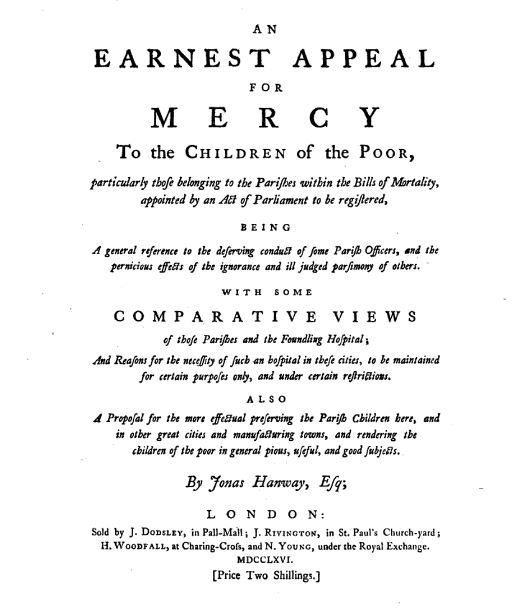 He returned to London in October 1750 and decided to give up all commercial pursuits. He was by now a changed man. Some fundamental change had taken place in him, which must have had its origins in the near-death experiences he had in Persia and Russia. He grew to despise arrogance, cruelty, and the exploitation of the weak, and resolved to struggle against it for the rest of his life. He turned out one pamphlet after another, advocating for things that we today take for granted. He proposed the paving of all of London’s streets; he founded the Marine Society, which promoted maritime trade; he pushed for the founding of hospitals, orphanages, and rehabilitation houses for reformed prostitutes. He even advocated for the rights of chimney-sweepers, who in his day endured terrible physical hardships. Not all of his reforms were successful; for some reason he believed tea-drinking was harmful and advocated–unsuccessfully–for its limitation.