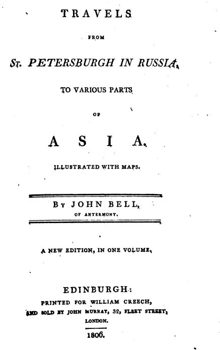 John Bell was born in 1690 in Antermony, Scotland. He seems to have decided at an early age to study medicine, but was lured into the world of adventure and travel by hearing stories of Peter the Great of Russia, who was a famous figure in Europe in the early eighteenth century. He resolved to visit Russia for himself, and set out to St. Petersburg in July 1714. The czar was preparing a delegation under the command of Aremy Petrovich Valenskyto travel to Persia; and Bell, with his medical background, volunteered to join the party as an attendant.