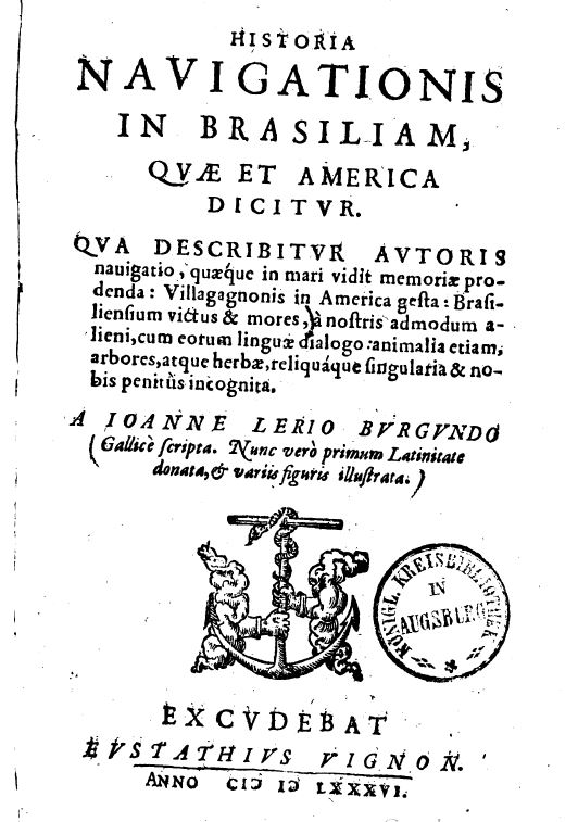 We turn now to the topic of early Brazilian exploration and travel. The Frenchman Jean de Léry (1534–1613) is a now-forgotten name from that age; but he was one of the first explorers of that dense, green land, and his name deserves to be better known. Born in Bourgogne, he was a Huguenot minister who emigrated to Brazil in 1556 to establish the first Calvinist colony in South America. He and his party set up a habitation on one of the islands off the coast of Rio de Janeiro. Infighting and the treachery of the colony’s leader scuttled the plan, so Léry left to live on the mainland among the Tupinamba Indians. He learned Indian habits and customs from first-hand observation, including the grisly practices of inter-tribal warfare and cannibalism. He eventually returned to France and became a minister, although he apparently never was truly able to reintegrate himself back into French life. His experiences in the New World had affected him permanently; he participated in some military campaigns but died of disease in 1616 at the age of 79.
