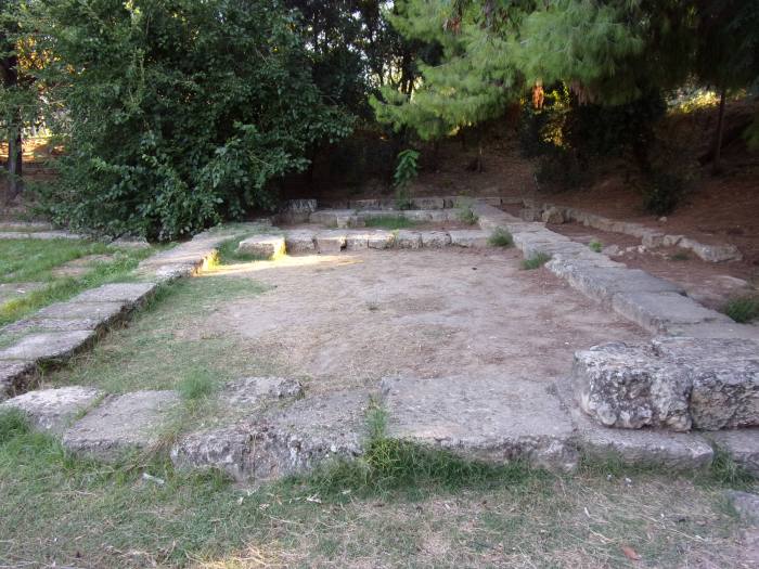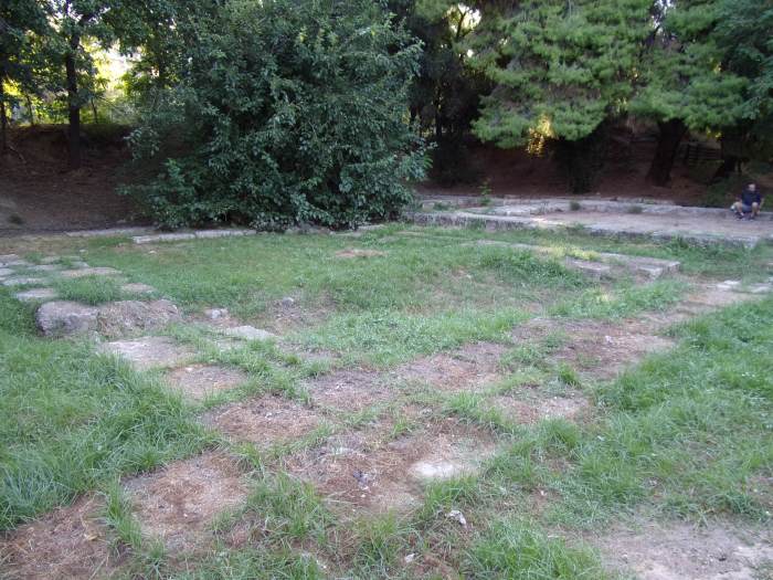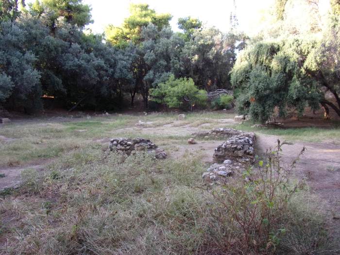 I could not spend time in Athens without walking this sacred ground. For me it was a very short walk: first along Elefsinion Street, then Lenorman, then Alexandrias, and then finally the Academica Platonica itself. The ruins are located in a public park in a residential area; in early morning it is serene and quiet, with dog-walkers, joggers, and elderly people starting their days. We are told that the site was only discovered in the 20th century; before that, scholars had a general idea of its location, but not a precise one. In classical times it was located in the midst of groves away from the city; now, of course, it is within the city, since Athens is far larger now than it was then. Instruction was offered on a variety of subjects at the Academy, including philosophy, mathematics, rhetoric, and probably others, including music.
