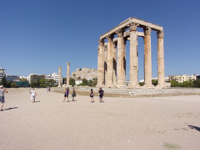 The temple would not be completed until the reign of the Roman emperor Hadrian, who formally dedicated it in A.D. 132. It was indeed a massive building, and must have been awe-inspiring to walk through in its prime: it contained over 100 columns, each one 55.5 feet high and 6.5 feet in diameter. Its interior housed an immense statue of Zeus, finished in ivory and gold. Not to be outdone, Hadrian apparently had statues of himself included in the building as well. Thus the building was not completed until over 600 years after it was first begun! The following short video gives one artist’s idea of what the completed structure looked like: