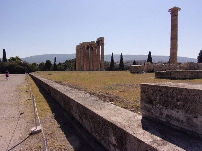 A short distance south-east of the Acropolis are the remains of a colossal temple called the Olympieion, or the Temple of Olympian Zeus. It was begun around 520 B.C. with the expressed purpose of being the largest and most impressive such structure in the Greek-speaking world, but it fell victim to political fortunes. Work on the temple was abandoned around 510 B.C. when one of its advocates, Hippias, was removed from power and expelled from Athens.