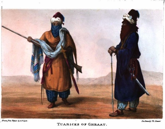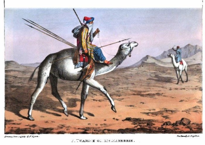 The expedition got as far as Murzuq, located in the Fezzan region of what is now southern Libya. There Ritchie died on November 2nd, worn out by the harsh desert conditions. Lyon himself also had fallen ill from the privations of the journey. The sultan who was with them, Mohammad al-Mukni, began to confiscate the expedition’s supplies, believing both men to be as good as dead. Captain Lyon recovered, however; although he was unable to continue into the interior of Africa, he spent his time wisely in southern Libya, observing the customs and practices of the Tuareg people, who at that time were nearly unknown to Europeans. Lyon seems to have been the first European to document in detail the customs, language, and culture of the Tuareg. Thus the expedition proved to be a successful one, even if it failed in the design for which it was originally contemplated. Consider these morsels of information: