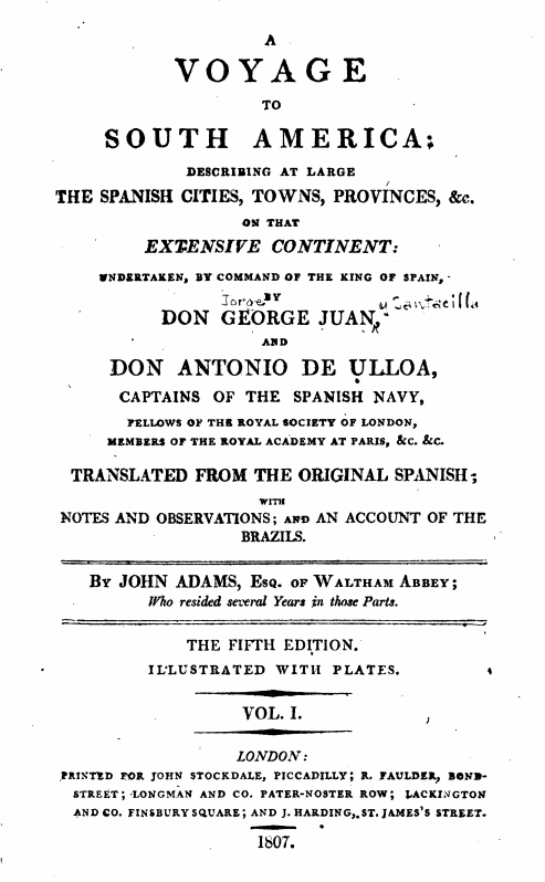 He finally left England in 1746 and made his way to Madrid. It had been eleven years and two months since he had first departed Spain for South America. His scientific observations were published in 1748 and he was accorded all due honor by the Spanish crown, and he retained his connection to the navy. In fact he was appointed governor of Louisiana in 1762, a territory that had recently been conveyed to Spain by France as a consequence of its defeat in the Seven Years’ War. Things did not work out well for him there, however; the local population of French colonists had no desire to be linked to Spain, and he found it prudent to return home. His memoirs of his travels in South America were translated into English and entitled A Voyage To South America. The rest of his life was spent in quiet scholarly pursuits; he died in July 1795 on the Isle of Leon.