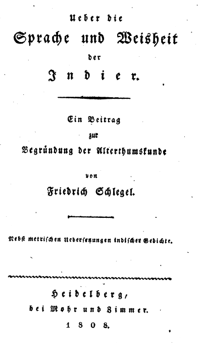 He was born in Hanover in 1772 and, like many great linguists, came from a clerical background. By 1799 he had become a fervent Romantic and was entirely devoted to literary activities; he was acquainted with Schiller and Goethe, but they seemed not quite to know what to make of this tumescent, artistic soul. But he was a dedicated scholar with a solid grasp of the major European and Near Eastern languages, and possessed an intuitive ability to find connections between things that many others before him had overlooked. His moment of glory came in 1808 with the publication of a tremendously influential booklet entitled Über die Sprache und Weisheit der Indier (On the Language and Wisdom of India). Here Schlegel made his case that Sanskrit and the European languages shared the same ancestor. As we have noted, he was not the first to make this observation; but he was able to articulate his points in a way that the public could understand, and this made all the difference. Sanskrit was no longer the exclusive provenance of specialists; it was presented to the European public almost as a fraternal language. Let us pause to examine the major points in this passionate admixture of scholarship and Romanticism.