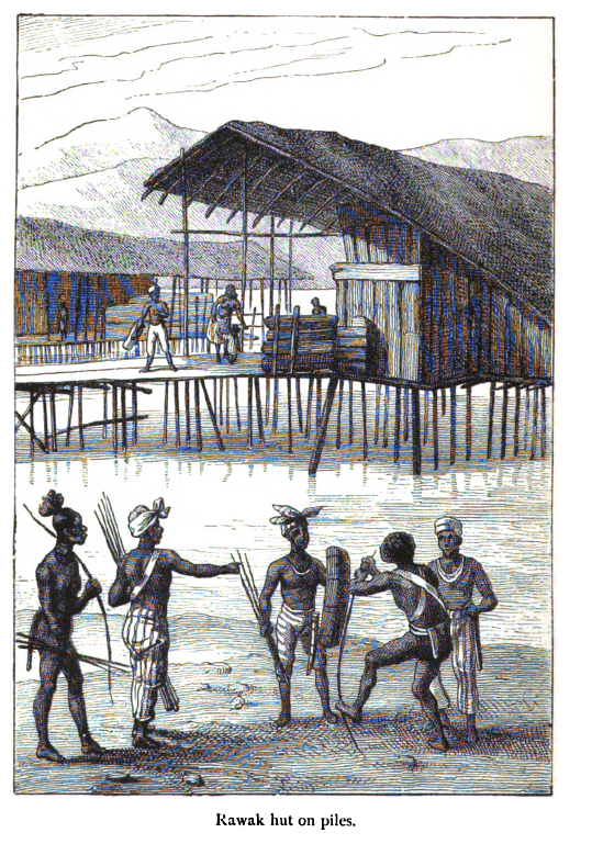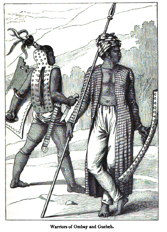 The points of the arrows were of hard wood, or of bone, and some of iron. The arrows themselves, displayed fan-wise, were fastened on the left side of the warrior to the belt of his sword or dagger. Most of these people wore bundles of palm leaves, slit so as to allow red or black colored strips of the same to be passed through to hold them together, which were attached to the belt or the right thigh. The rustling sound produced with every movement of the wearers of this singular ornament, increased by knocking against the cuirass or the buckler, with the addition of the tinkling of little bells, which also formed part of the warrior’s equipment, altogether made such a jumble of discordant sounds that we could not refrain from laughing.