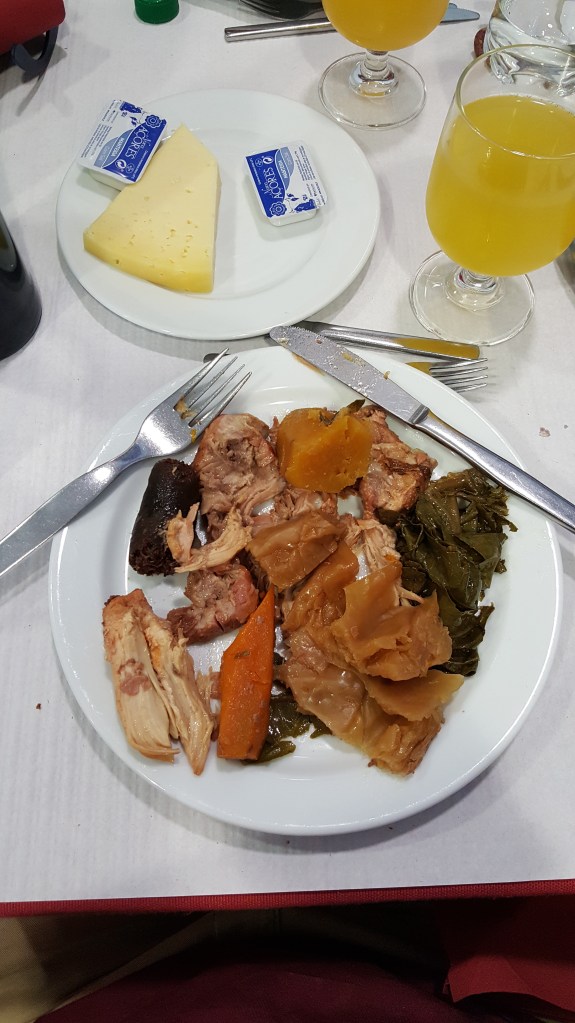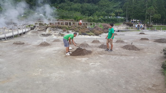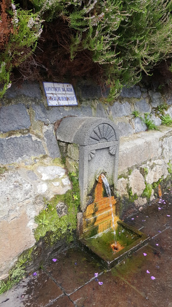 Another scenic view visited was Santa Iria, which provides a stunning view of San Migue’s coastal cliffs. We then drove on to the small town of Furnas and the Lagoa das Furnas, a place famous for its geothermal activity, produced by the area’s underground vulcanism. One of the attractions is to see workers placing parcels of food in the geothermal vents (a privilege for which restaurants and individuals pay a small fee of 3 euros). We then moved on to a restaurant that actually served us a meal from the meats, blood sausage, potato, and cabbage cooked in the vents. There are some very interesting things here: one vent offered potable water that was naturally carbonated. Our guide also showed us something equally unexpected: cigarette smoke wafted in the direction of the geothermal, sulfurous steam increased the steam’s visibility. I am not sure how the interaction of the gases and the steam caused this effect, but it was demonstrated repeatedly.