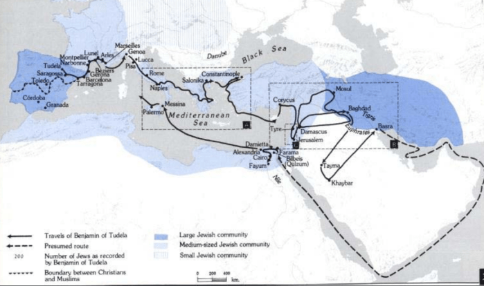 He was born in the city of Tudela, in the Kingdom of Navarre in Castile around 1130. It is a tragedy that we know so little of his early life, but it seems he was raised as a devout Jew and became proficient in rabbinical learning by his early adulthood. His name in Hebrew is given as בִּנְיָמִין מִטּוּדֶלָה; the Arabs, who respected him highly, know him as Binyamin Al-Tutayli (بنيامين التطيلي). Spain in his era was a ferment of languages and cultures; without doubt Tudela would have been proficient in Arabic, Spanish, and Hebrew, and probably Latin, by the time he set out on his travels. His interests in business and a curiosity about Jewish communities in foreign lands, emerge as likely early incentives to travel. But once the lust for travel gets in a man’s blood, he is impelled by an irresistible forward momentum that has a logic all its own.