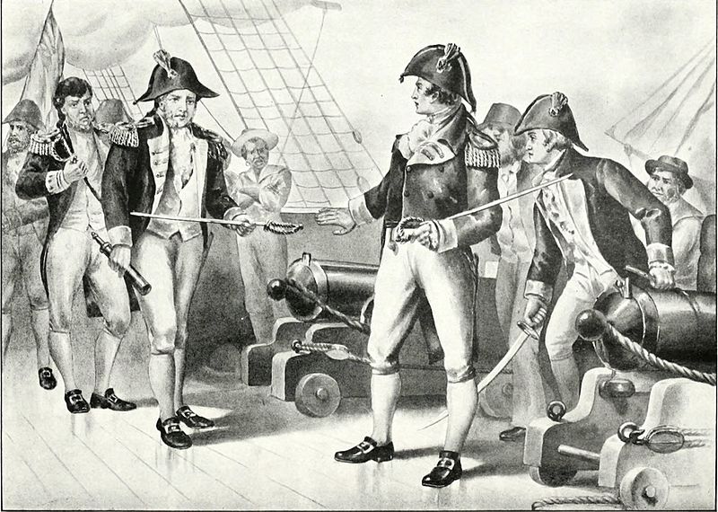 Humphreys now assumed that the Chesapeake was playing for time and readying its guns. He fired three full broadsides into the helpless American vessel, killing three sailors and wounding eighteen others, including Commodore Barron himself. Barron, realizing he had no cards to play, struck his colors. We are told that a lieutenant William Allen, in a pathetic attempt to offer token resistance, carried a live coal from the galley and was able to fire off a shot at the Leopard. A boarding party was then sent to search the Chesapeake and find the deserters; four men were quickly located, placed in restraints, and hauled back to the Leopard. Humphreys then sailed away, leaving the Chesapeake to lick its wounds and limp back to port. It was a humiliating conclusion to an encounter that had caught Commodore Barron completely by surprise.