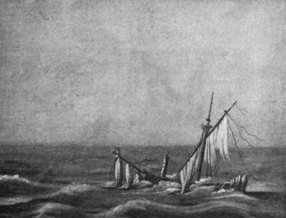They used to hang in the boys’ room when I was one of the boys, thirty years before. They were old then, and the worm-eaten frames were dropping off; but their very age added to the regard in which we held them as rare works of art. They dealt, evidently, with the same subject: an old-time, full-rigged ship, carrying the Danish flag, in a rough sea; a wreck in the foreground. In one picture a boat, steered by an officer in a red coat, is seen approaching the wreck, upon the bowsprit of which sits a man, lashed to the spar, imploring aid. In the other the man has been taken off, and the Danish ship is under sail again, the wreck sinking. One of its two masts has fallen. That they told a story was apparent, but what that story was there was nothing to show. On neither painting was there title or name of the artist.