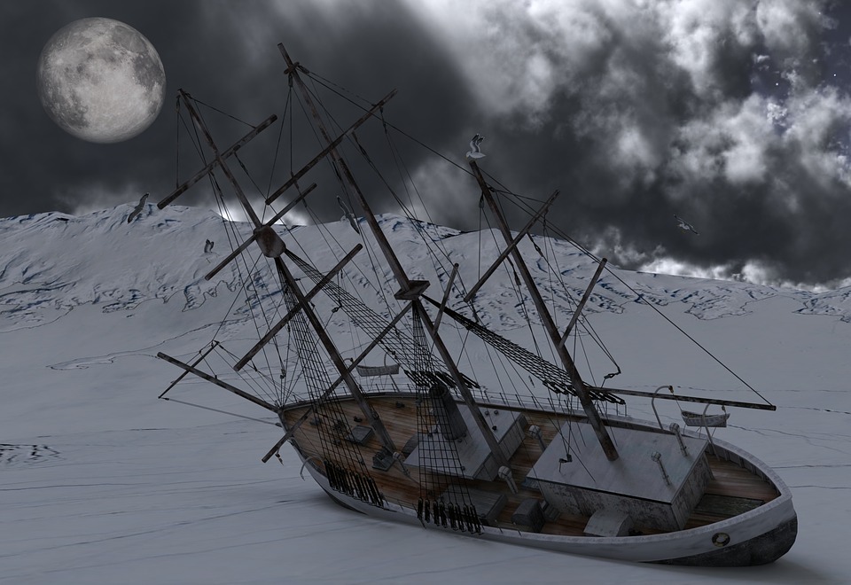 Together with a small crew, the two men, Last and Manton, sailed from Port Philip Heads through the Bass Straits, and tried to make their way to the region where the old clipper ship might be located. Like so many other ships, the Black Dog became trapped in shifting ice fields; soon she was crushed between two massive floes and vanished. Manton and Last escaped by leaping onto the ice; the rest of the crew perished. The two men realized that they had no other option but to hike in the direction of where they thought the Starry Crown could be found. After miles of hiking, the two battered, exhausted men spied what looked like ship’s rigging protruding from a white horizon. It was the Starry Crown; she was still there, beckoning the treasure-seekers, calling out to them through the silent, frozen air.