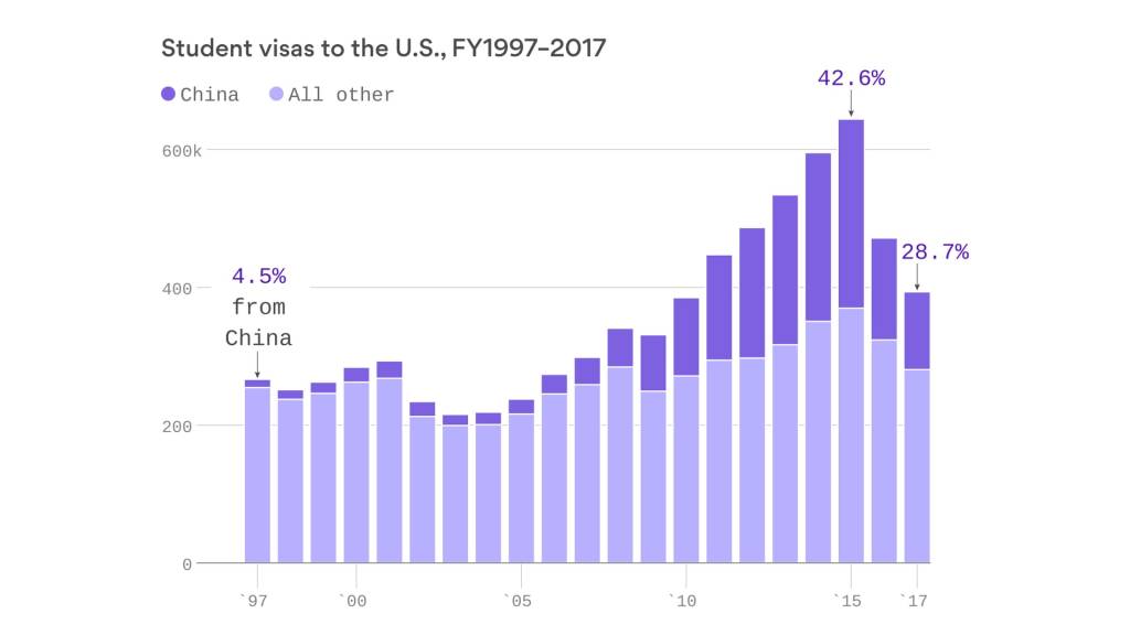The discernment of a festering evil, says Aristotle, requires not just an ordinary man, but a true statesman.  Unfortunately, this is precisely what the current political scene lacks.  To give just one out of many possible examples, I was recently shown the following graph, which displays the number of student visas given out by the United States from 1997 to 2017: