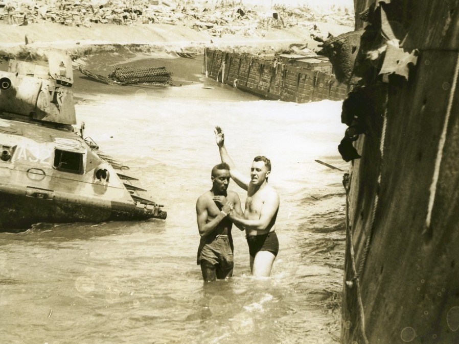 Yet the human mind always finds ways of adapting to difficult circumstances—even the most horrific circumstances. I was recently reminded of this while searching through old photographs in the U.S. Marine Corps Archives. This is a hobby of mine that brings me much satisfaction. As I was poring over the photos in the John H. Craven Collection (a Marine chaplain), I came across one photograph that was one of the most remarkable Pacific War photos I had ever seen. It was a picture of Chaplain Craven baptizing a man on the wrecked beach at Iwo Jima in 1945. The beach is littered with the wreckage of war: twisted metal, smashed hulks of ships, and debris of all kinds. The picture appears to have been taken a few days after the fighting had ended, but I am not sure. This is the photograph: