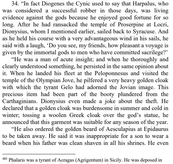 The following are some other excerpts from the book. The truth is, says Cicero, that evil not only exists, but often triumphs or goes unpunished. He provides some examples, in a passage from III.34: