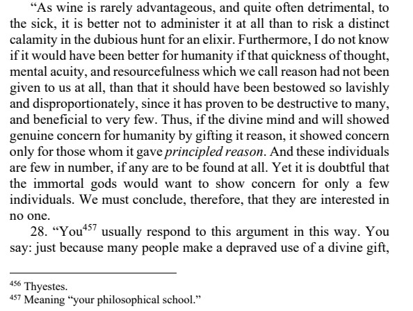 Below is a passage from III.27. There are many fools in the world, and perhaps the divine will cares only about those whom it gave “principled reason.” In fact it may be that the gods care nothing about us at all: