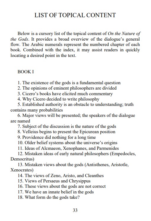 A new and annotated translation of On the Nature of the Gods has been needed for many years. The text demands readable modern diction, conventional formatting, and a sentence structure free of Victorian archaisms and interminable clauses held together by rickety semicolons. At the same time, there must be a scrupulous fidelity to the words and tone of the original work. This is the approach I have used in translations of other Ciceronian treatises. It is hoped that this present effort will help revive interest in an undeservedly overlooked classic of Western thought.