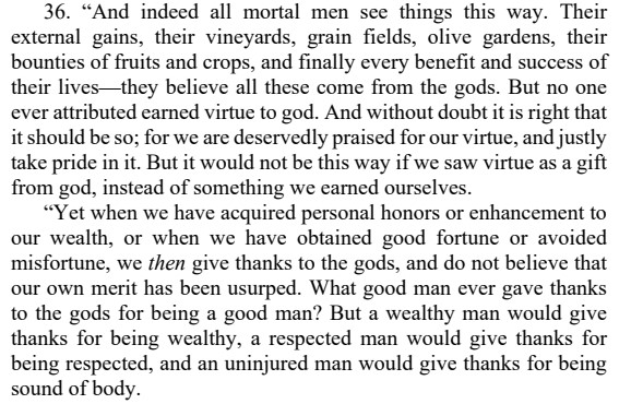 We may attribute material wealth to divine favor. But no one, says Cicero, ever attributed earned virtue to a god. We know that virtue has to be earned, and not gifted (III.36):