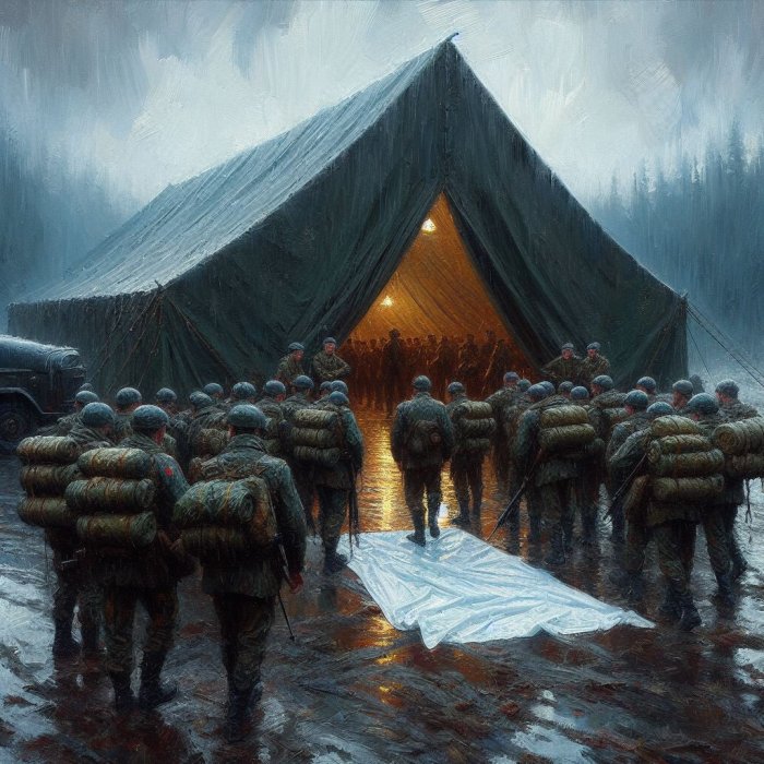 Forced to enter the tents, the recruits hesitate when they see the white towel. Fearing some unannounced test, they do not wish to besmear the white fabric with foul mud. Most of them will leap over the white towel to enter the tents. Suvorov describes the scene: