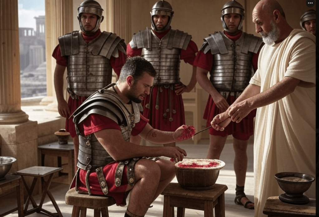 But does this explanation really suffice? I think there is something implausible about it. The Romans were not very keen on seeking medical excuses for criminal behavior; they were, in fact, very keen on using ritual and symbolism to psychologically dominate those they believed needed the lessons of compliance impressed upon them. Compelling a vanquished foe to pass sub iugum (“under the yoke”), the holding of triumphs, the taking of hostages, and a hundred other examples from Roman history: these were carefully calculated mechanisms of intimidation and control. Likewise, it is plausible to speculate that the ritual drawing blood from a soldier was done to inflict some psychological lesson on him. He would be shamed in front of his comrades. He would, perhaps, be made to feel unworthy of a wound incurred in actual battle. Rather than spill his blood against an opponent, he would have it spilled in a shameful way, for the most disreputable reason.