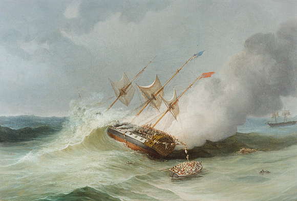 On the one hand stood death by fire, on the other death by water; the dilemma was dreadful. Preferring always the more remote alternative, the unfortunate crew were at one moment at ternpting to check the fire by means of water; and when the water became the most threatening enemy, their efforts were turned to the exclusion of the waves, and the fire was permitted to rage with all its fury. The scene of horror that now presented itself, baffles all description. The upper deck was covered with between six and seven hundred human beings, many of whom, from previous sea sickness, were forced on the first alarm to flee from below in a state of absolute nakedness, and were now running about in quest of husbands, children or parents.