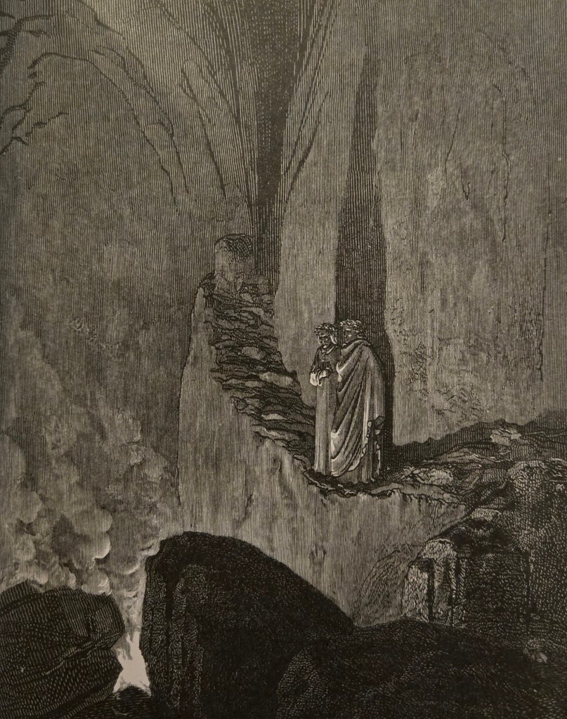 Dante arranges the scene, as always, with unforgettable clarity. He ascends a precipitous rock with his trusted guide, Virgil, and stands upon a bridge: